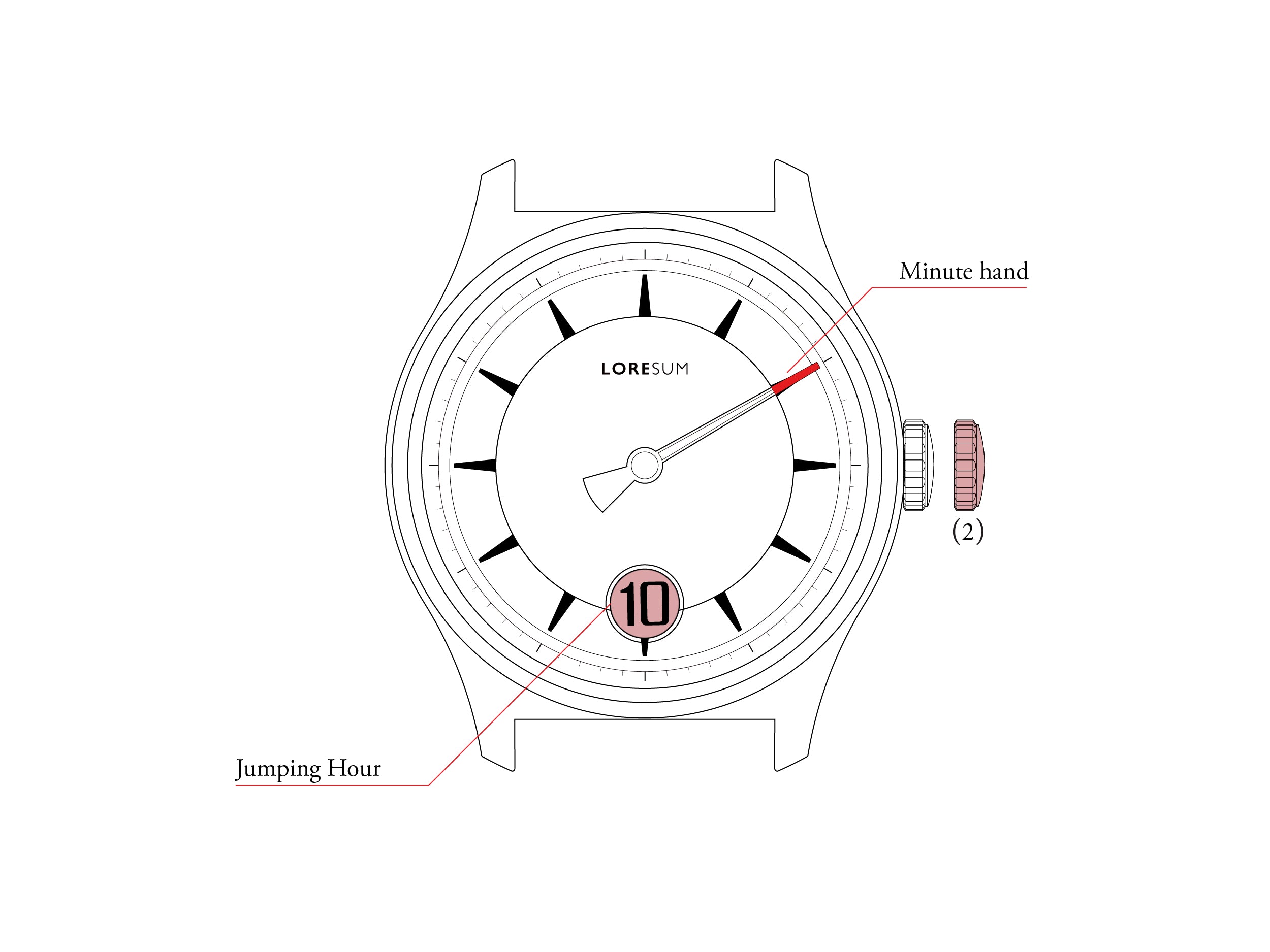 To set the hour and minute hands, pull the crown out to the second notch (position 2). Set the hour, minute by turning the crown in either direction. Push in the crown, the time is set.