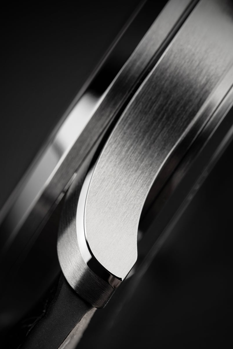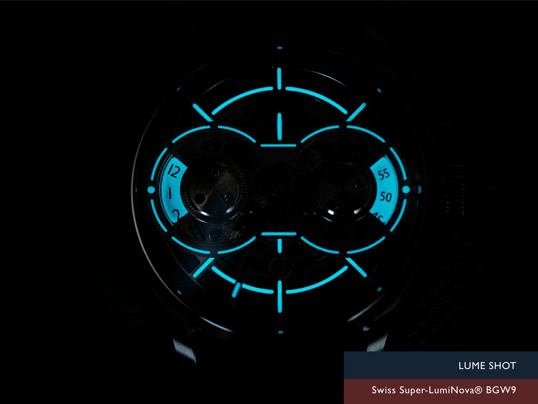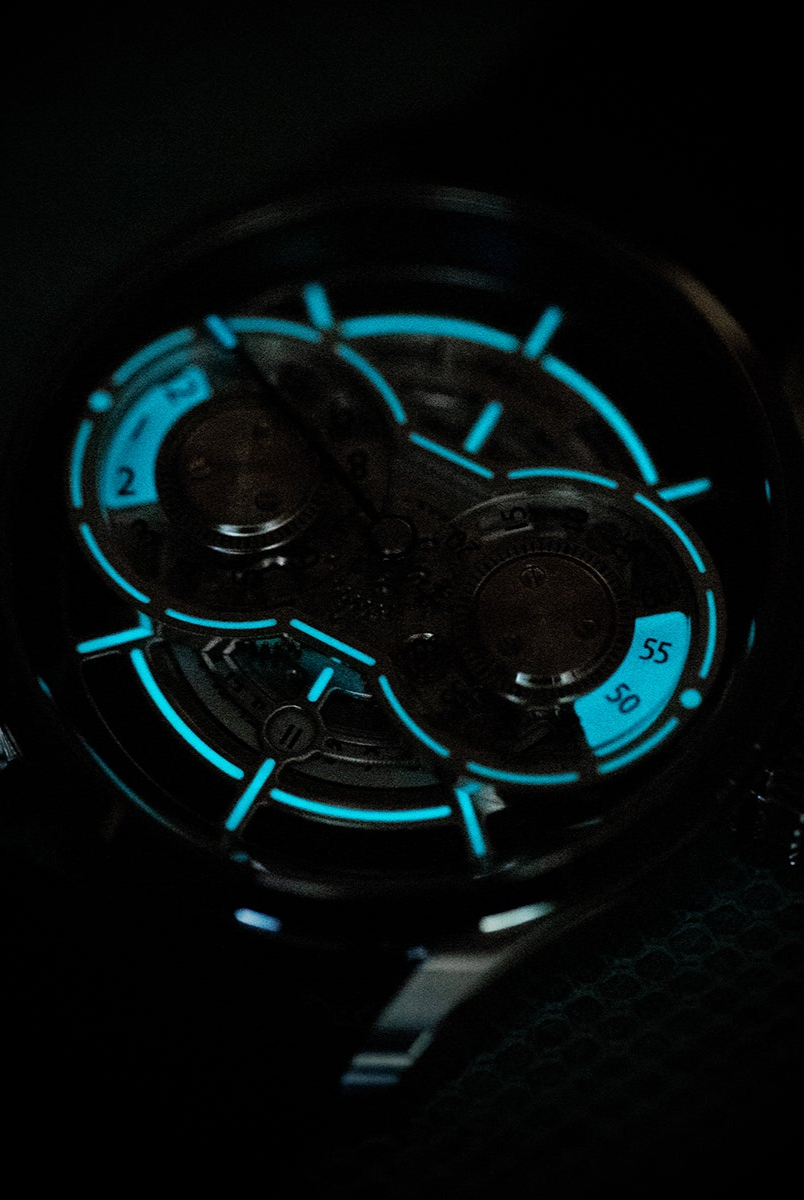 The exact minute and hour is indicated by a dotted marker on the perimeter of both discs. At night, the space beneath this area glows to illuminate the time. The nook is filled with Swiss Super-LumiNova BGW9 to ensure maximum visbility even in the dark.