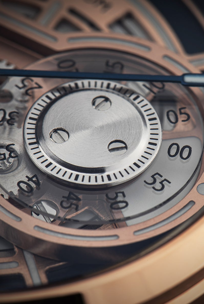 This is a watch like no other. The design combines the 2D view of a map with the 3D elements of a cross-section. Paired with an entirely new time telling system, it has no parallel. The moment the watch is wound, this sensation is brought to life. The gears grind, discs turn, and the railway system operates full steam ahead. Close and intimate is the best way to admire the spectacle and wonder of this piece.