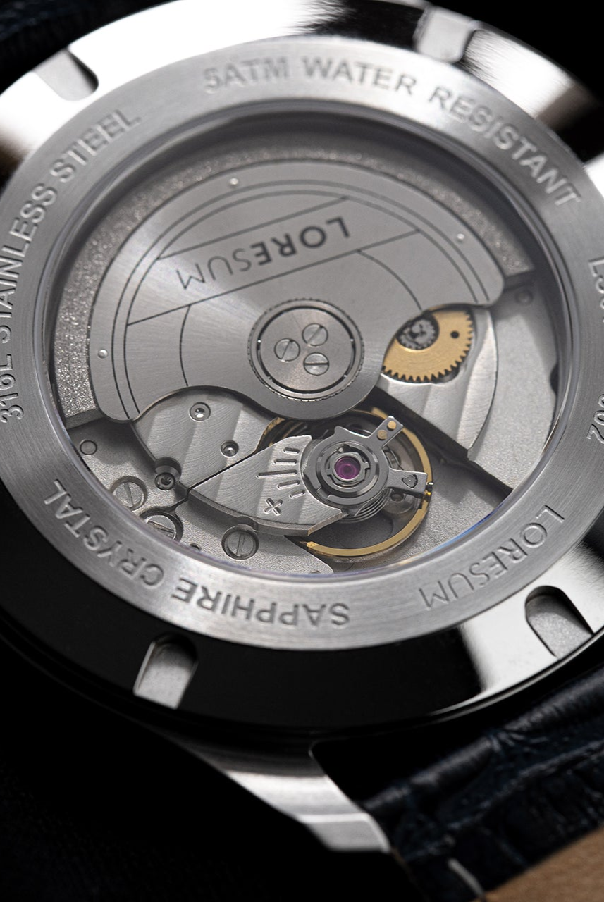 This Japanese movement is slim but high performing. Despite it being only 3.9mm in thickness and 26mm in diameter, it contains 24 jewels and boasts a frequency of 4Hz (28, 800 A/h). It also has a 42 hour power reserve, automatic winding, and sweep second movement. Not to be deterred by its many functions, the Miyota 9015 is stable and reliable. It’s a first-rate movement limited to elite watches that LORESUM is willing to pay for.