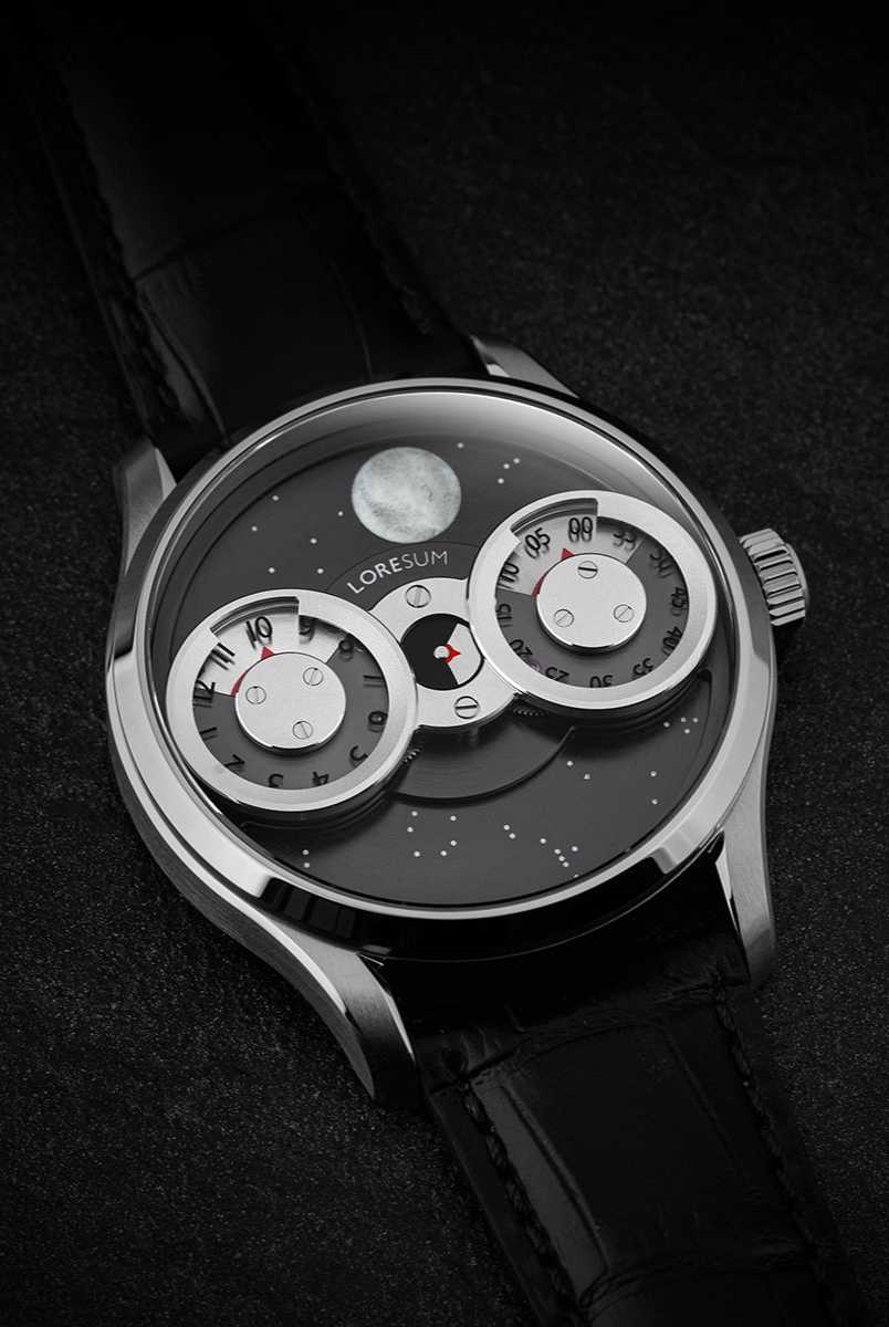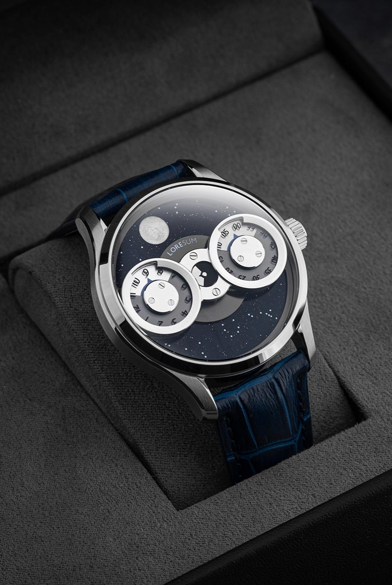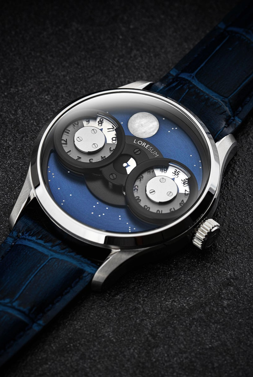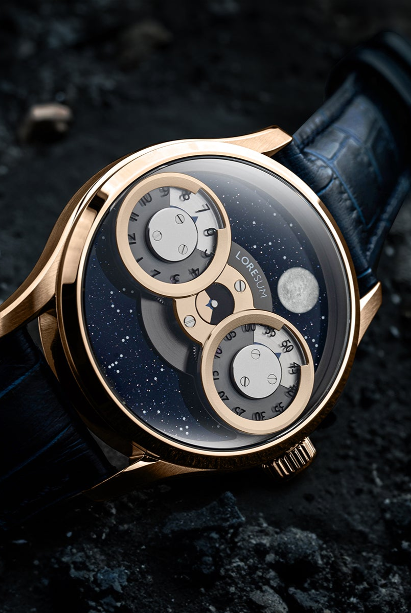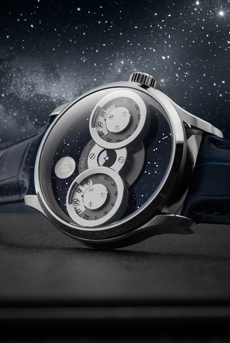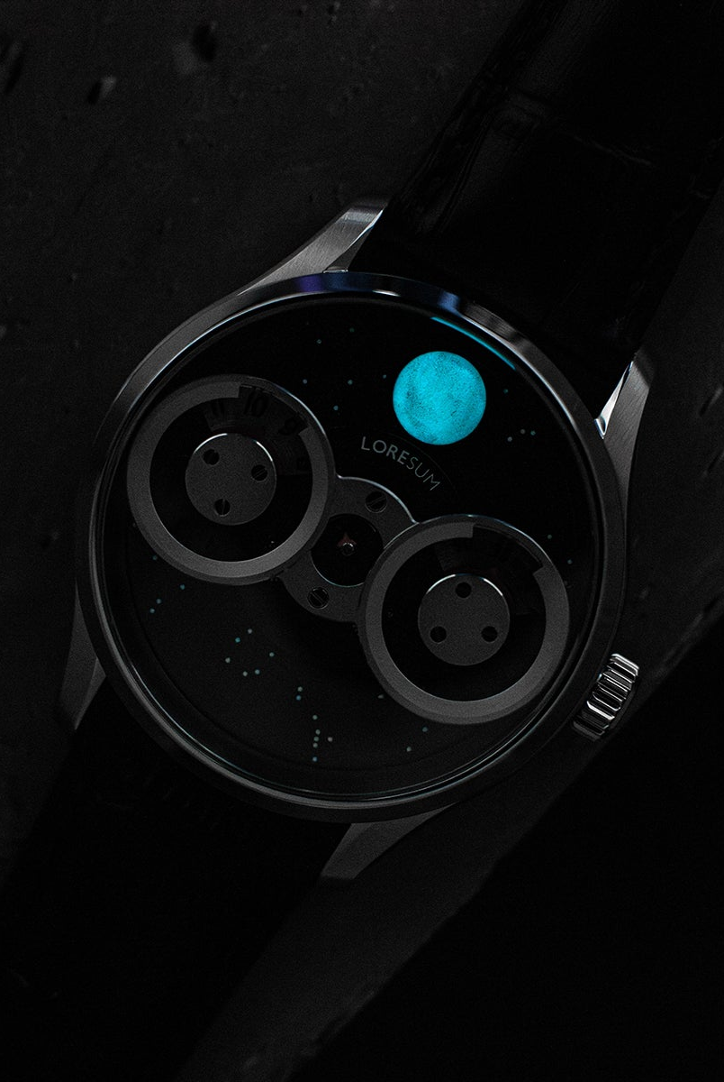 The LS03 showcases an original regulator module, meticulously developed based on the Miyota 9015 movement, with tailored modifications to seamlessly integrate with the moon indicator. The hour disc on the left, the second disc in the centre, and the minute disc on the right, have a perfect horizontal alignment. At specific angles, the mesmerizing rotating gears become visible, showcasing the full splendour of our in-house module. Our primary goal is to achieve the ideal equilibrium between the minute, hour and second discs, ensuring a harmonious display of time. Additionally, we have dedicated significant attention to creating an expansive and prominent moon indicator, allowing it to captivate attention with its striking presence. Through this deliberate design, we have strived to bring forth a timepiece that embodies our vision of perfection.