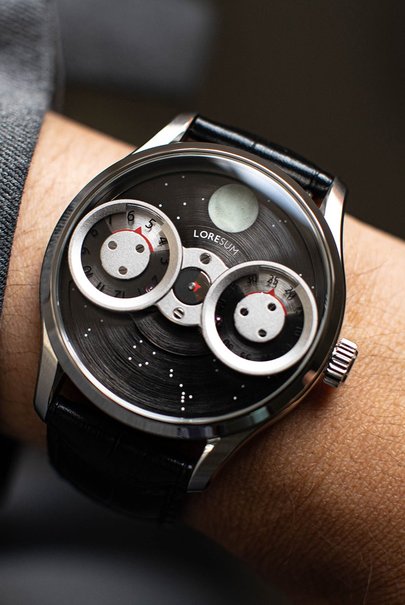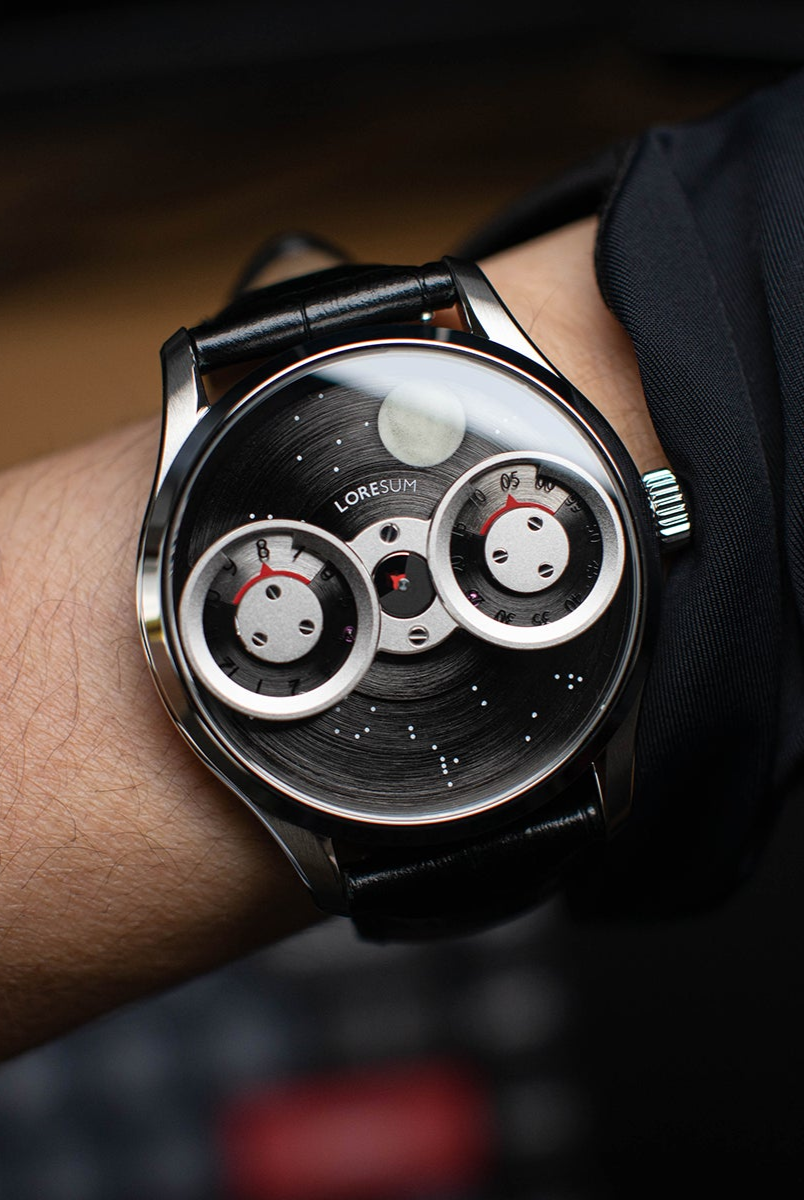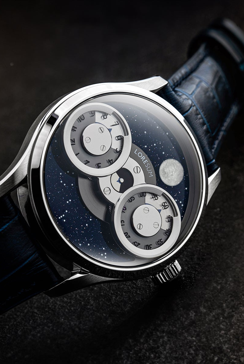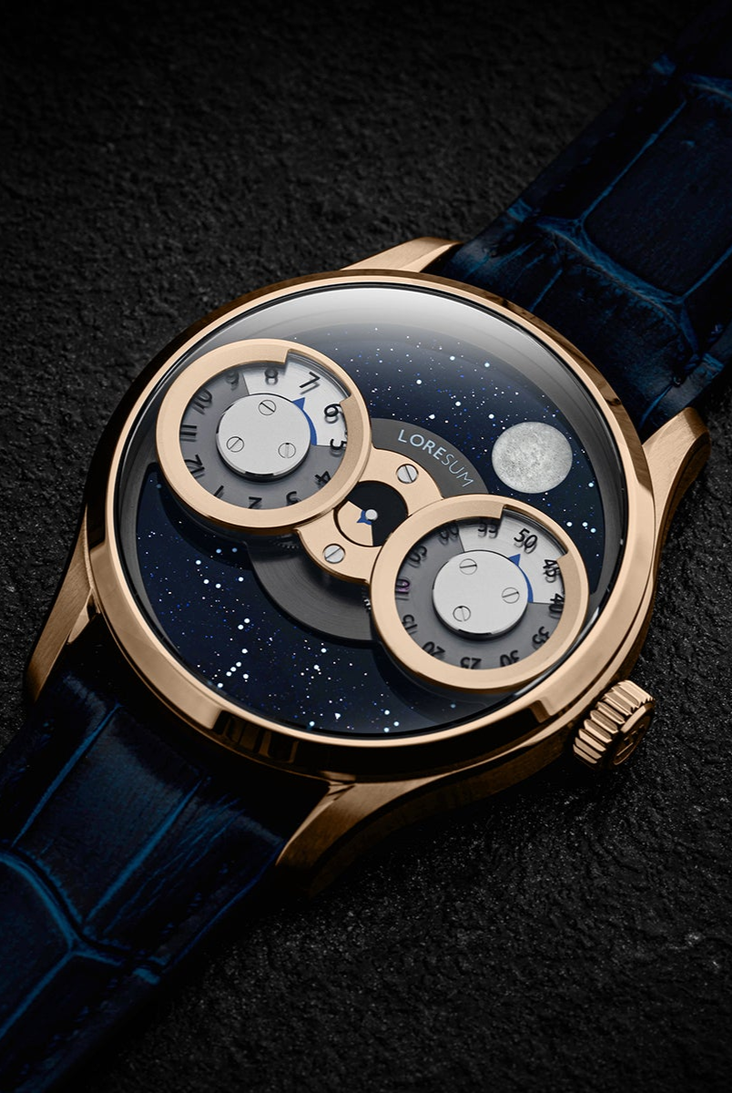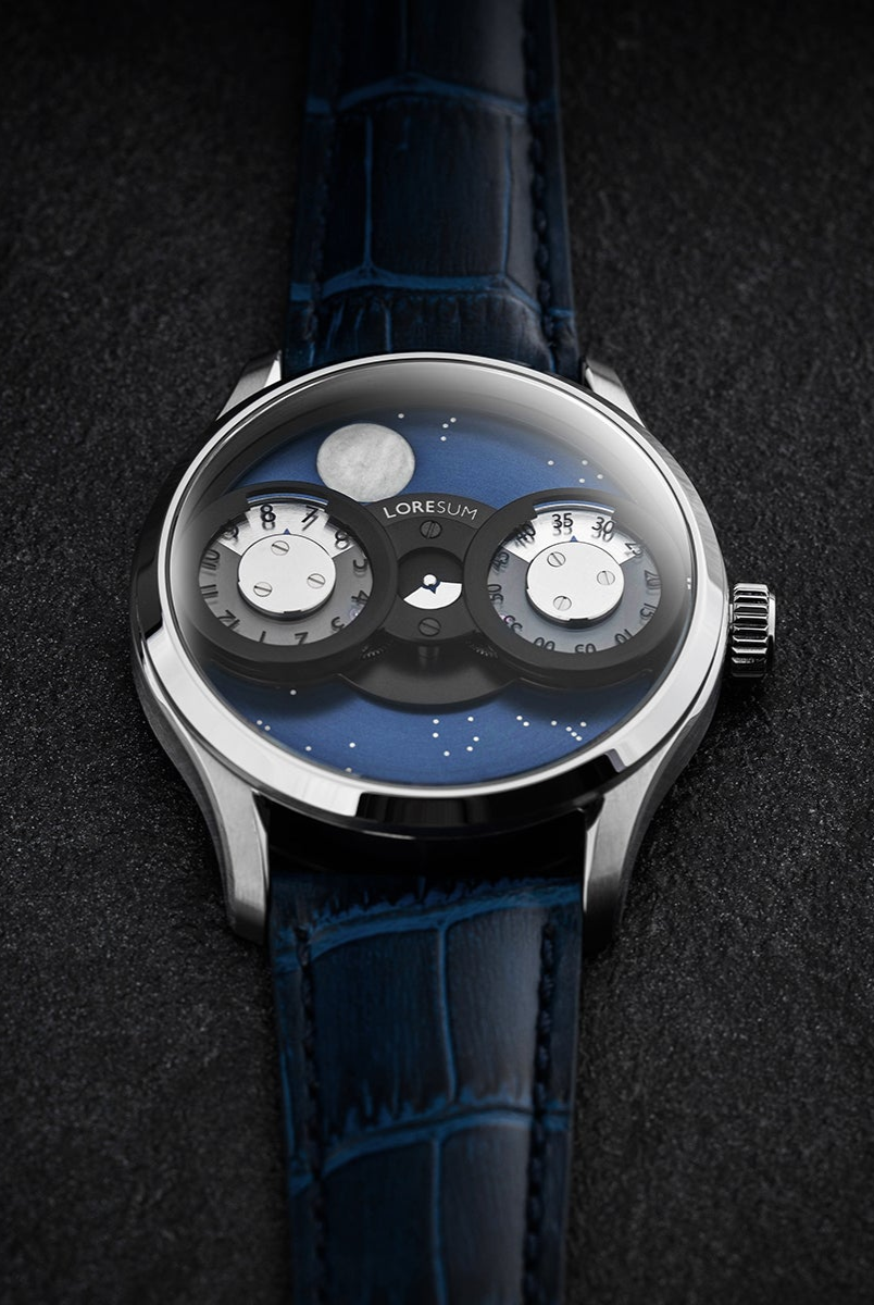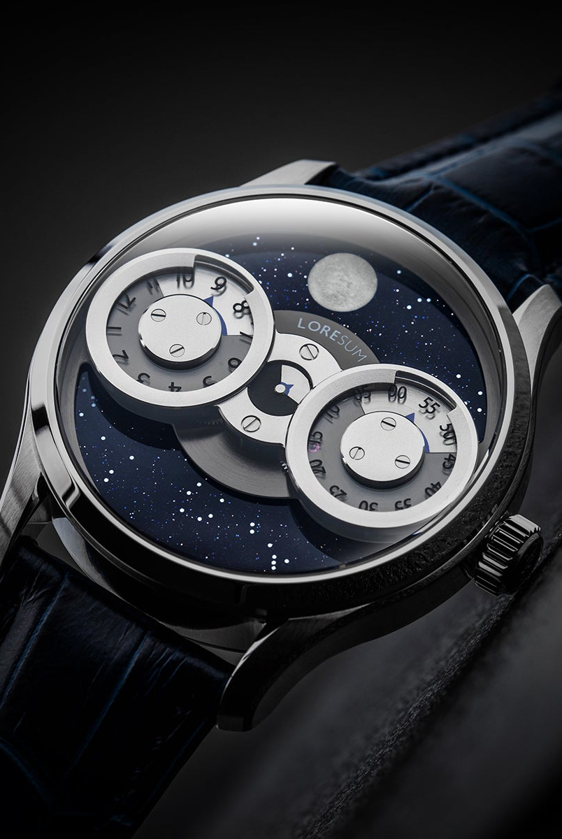 The LS03 showcases an original regulator module, meticulously developed based on the Miyota 9015 movement, with tailored modifications to seamlessly integrate with the moon indicator. The hour disc on the left, the second disc in the centre, and the minute disc on the right, have a perfect horizontal alignment. At specific angles, the mesmerizing rotating gears become visible, showcasing the full splendour of our in-house module. Our primary goal is to achieve the ideal equilibrium between the minute, hour and second discs, ensuring a harmonious display of time. Additionally, we have dedicated significant attention to creating an expansive and prominent moon indicator, allowing it to captivate attention with its striking presence. Through this deliberate design, we have strived to bring forth a timepiece that embodies our vision of perfection.