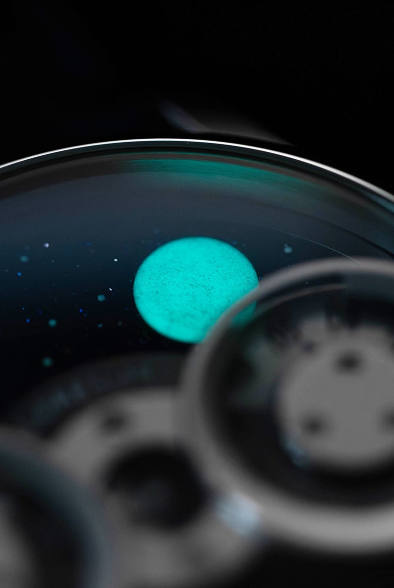 To showcase the resplendence of the moon in all its glory, we have developed an exclusive in-house moon indicator module specifically for this project. This innovative module allows the moon and the stars to smoothly rotate across the dial. As it passes by the minute and hour discs, it hides underneath the hour and minute modules, presenting the captivating beauty of the moon phase.