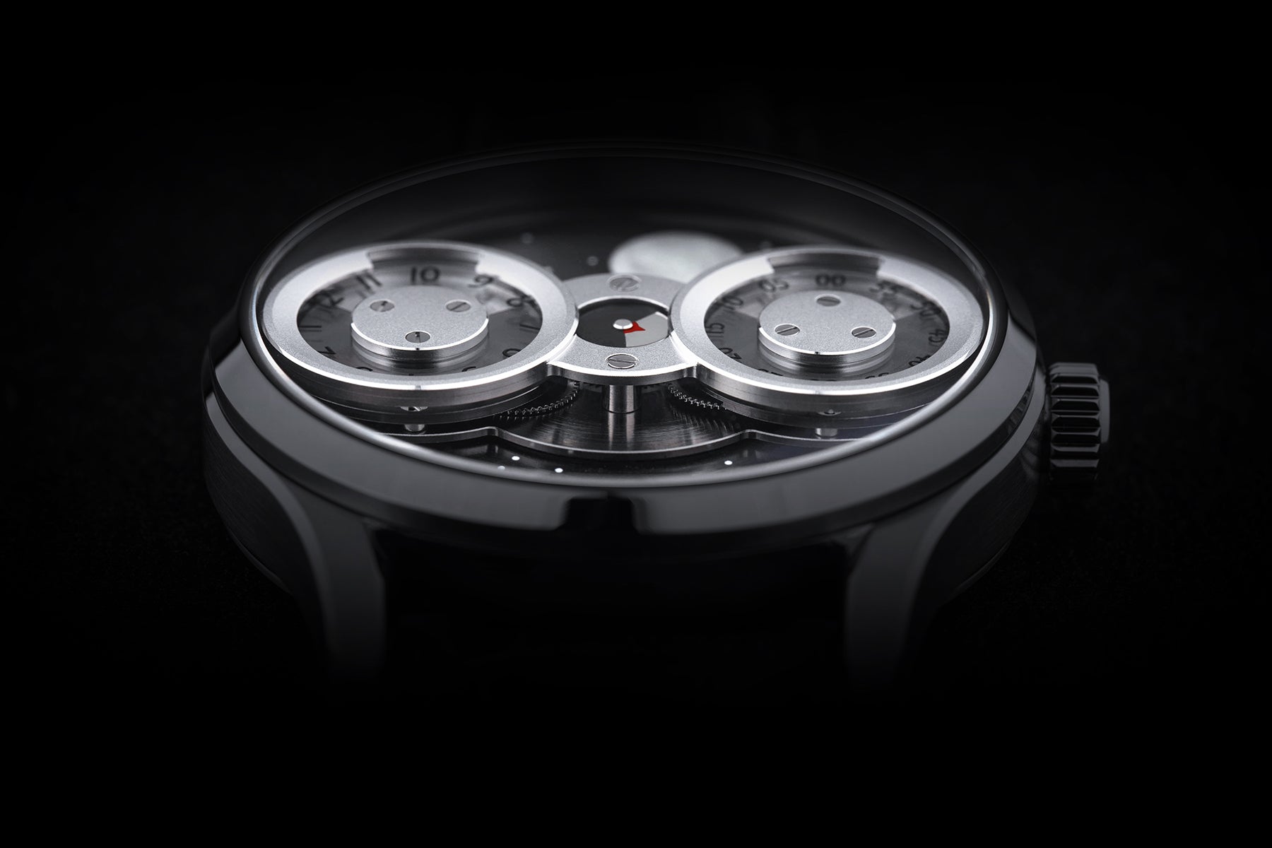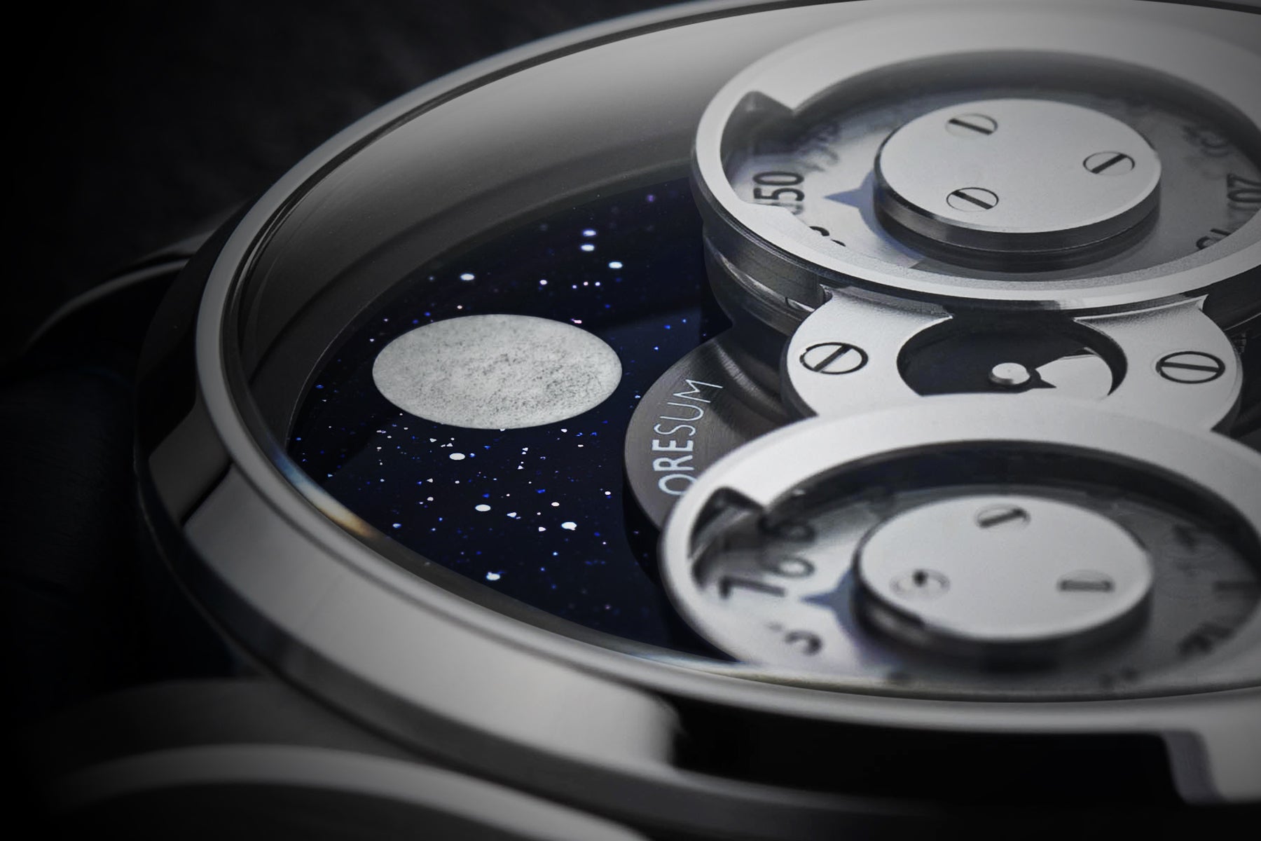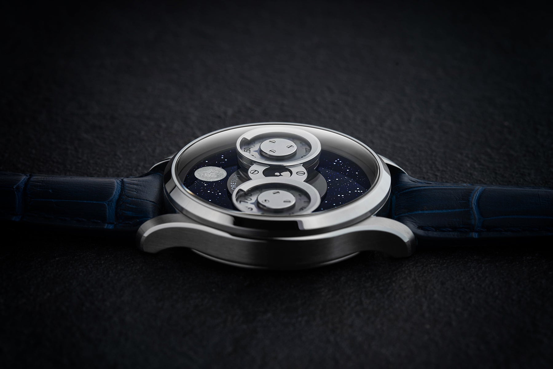 To showcase the resplendence of the moon in all its glory, we have developed an exclusive in-house moon indicator module specifically for this project. This innovative module allows the moon and the stars to smoothly rotate across the dial. As it passes by the minute and hour discs, it hides underneath the hour and minute modules, presenting the captivating beauty of the moon phase.