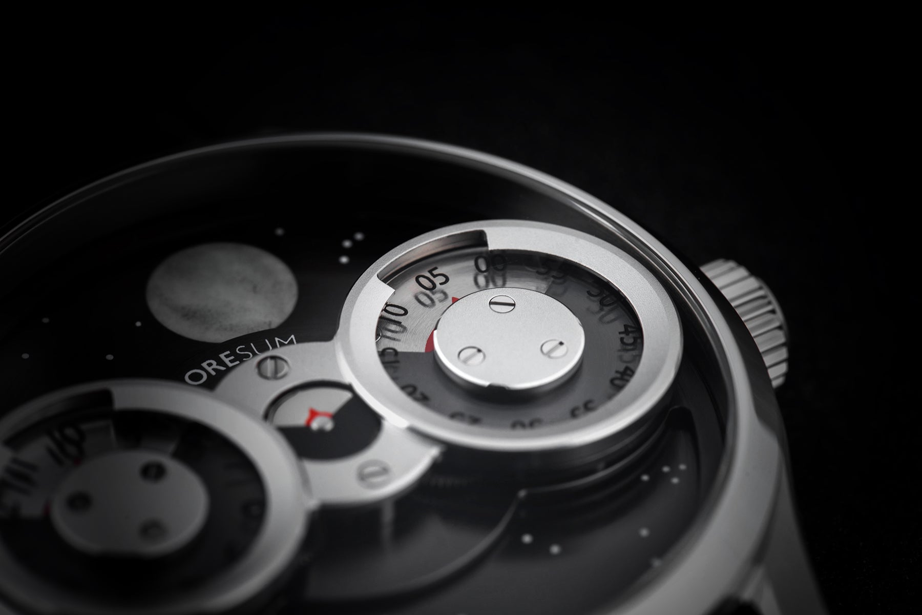 The LS03 showcases an original regulator module, meticulously developed based on the Miyota 9015 movement, with tailored modifications to seamlessly integrate with the moon indicator. The hour disc on the left, the second disc in the centre, and the minute disc on the right, have a perfect horizontal alignment. At specific angles, the mesmerizing rotating gears become visible, showcasing the full splendour of our in-house module. Our primary goal is to achieve the ideal equilibrium between the minute, hour and second discs, ensuring a harmonious display of time. Additionally, we have dedicated significant attention to creating an expansive and prominent moon indicator, allowing it to captivate attention with its striking presence. Through this deliberate design, we have strived to bring forth a timepiece that embodies our vision of perfection.