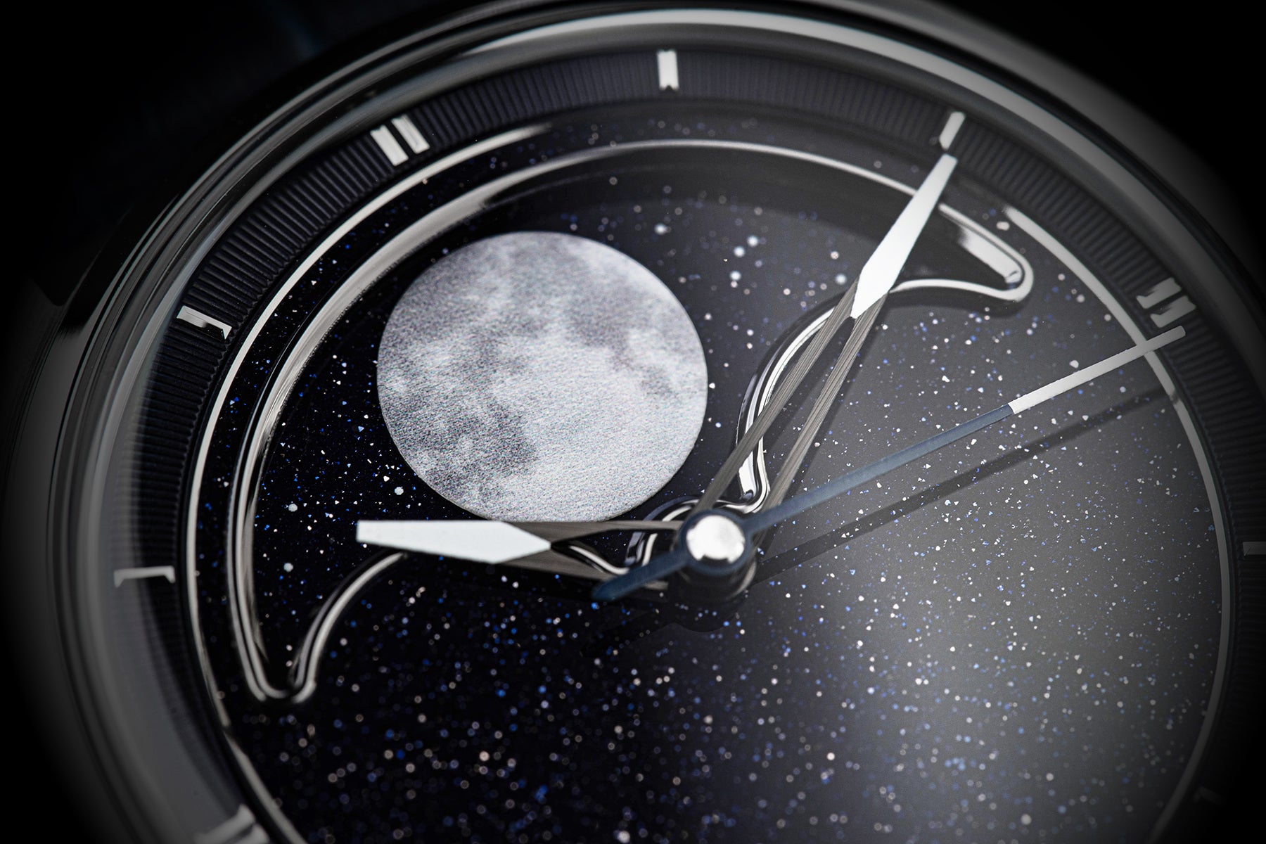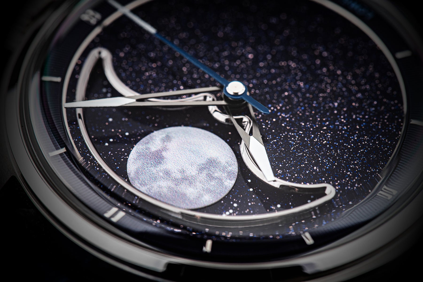 The skeletonized hands were custom-designed to avoid obstructing the aventurine dial or mother-of-pearl moon. When these hands overlap, they form a unique triangle with dual luminescent areas, creating a distinctive spear-like shape. To maintain a balanced shine and not overshadow the brilliance of the aventurine dial or moon, we applied a linear brushed finish and coated the hands with a gunmetal plating. Additionally, these hands are luminescent with Swiss Super-LumiNova® to aid legibility in low-light conditions.