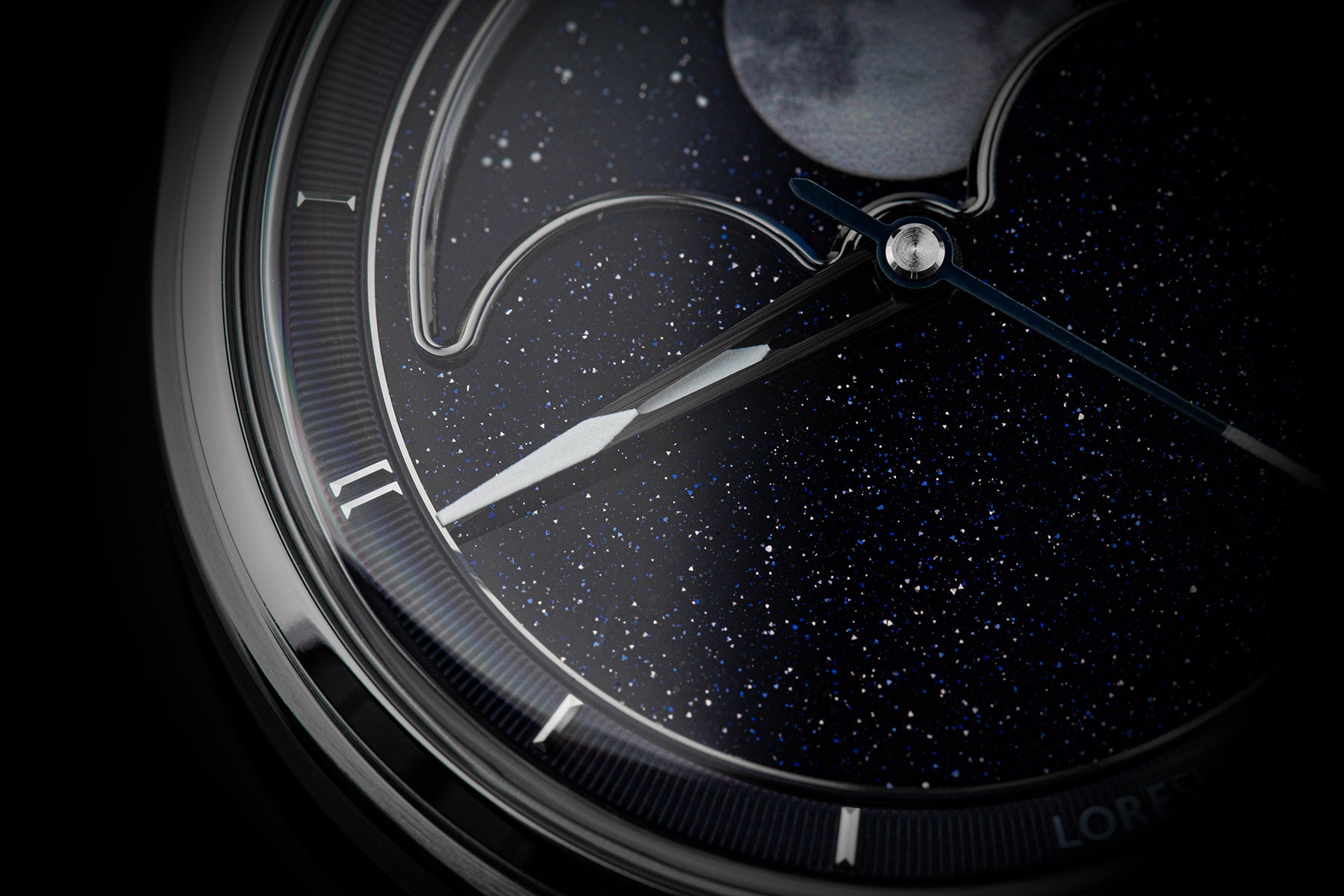 The central focus of the watch is the moon, and we aimed for excellence in its representation. After experimenting with various methods, we settled on a distinctive approach – a mother of pearl circle cut-out featuring a 3D-printed moon texture. This design vividly captures the intricate details of the actual moon, creating the illusion of a celestial body adorning your wrist. To enhance its prominence, the moon is delicately embraced by a CNC mirror-polished frame. Positioned on a single rotating aventurine disc, the moon is surrounded by luminescent stars that glow in the dark, thanks to the application of Swiss Super-LumiNova®. This uncompromising craftsmanship achieves a luminous night sky effect, making the watch a captivating celestial companion.