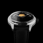 This watch features a gold-plated moon with that historic first step on the moon surface, a 39.5mm stainless steel case with box-shaped sapphire glass, ensuring clarity and durability of the watch face. The black onyx dial symbolizes the infinite universe, with the dark dial representing humanity's quest and exploration of the unknown space.