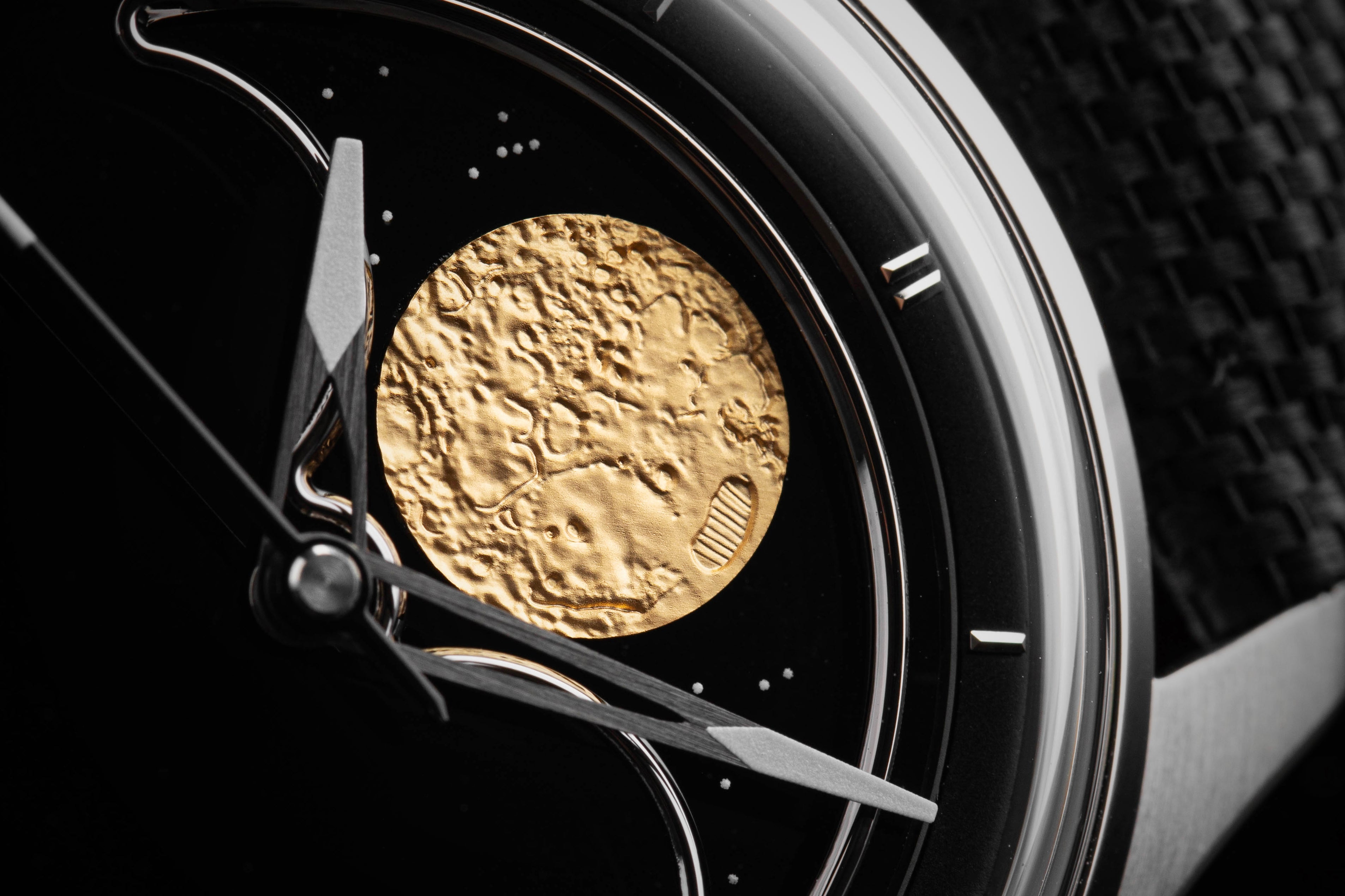 Look closely at the gold-plated moon phase on the dial – on the right side, you’ll see a subtle imprint symbolizing that historic first step on the moon surface.