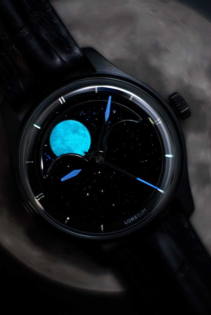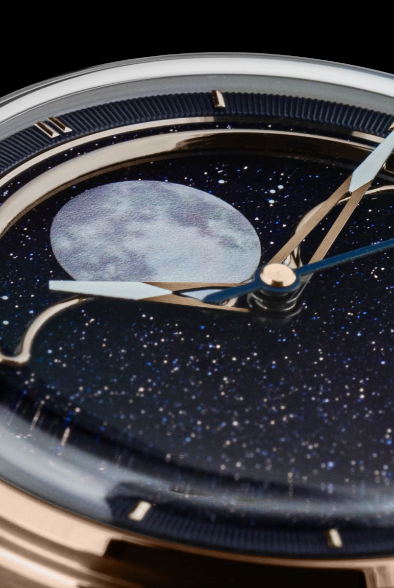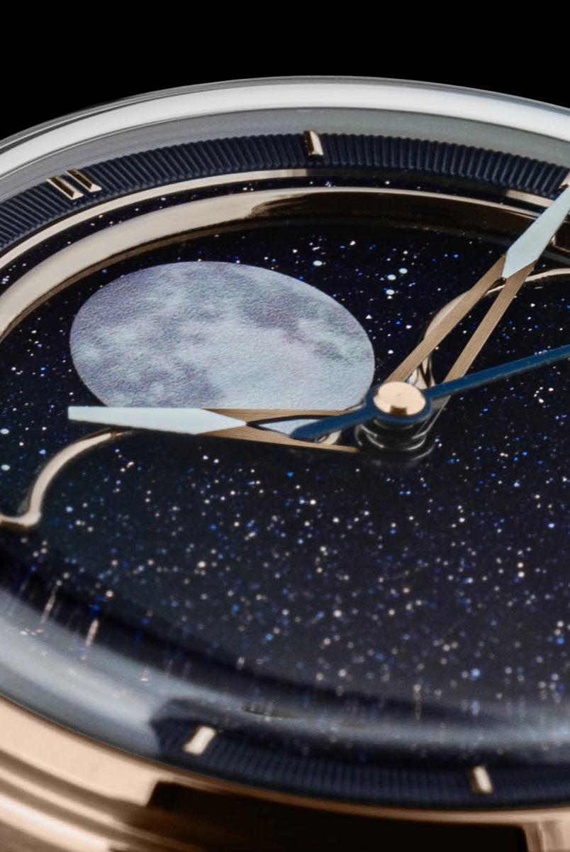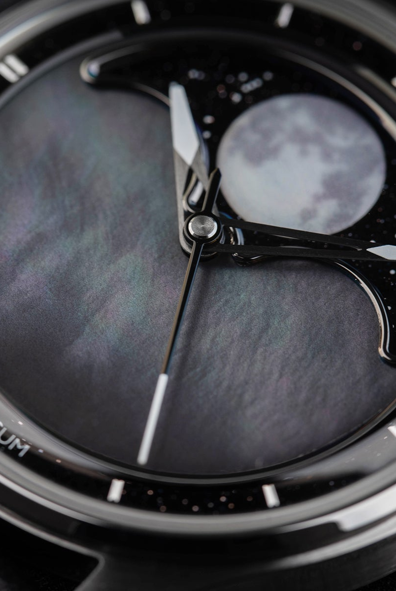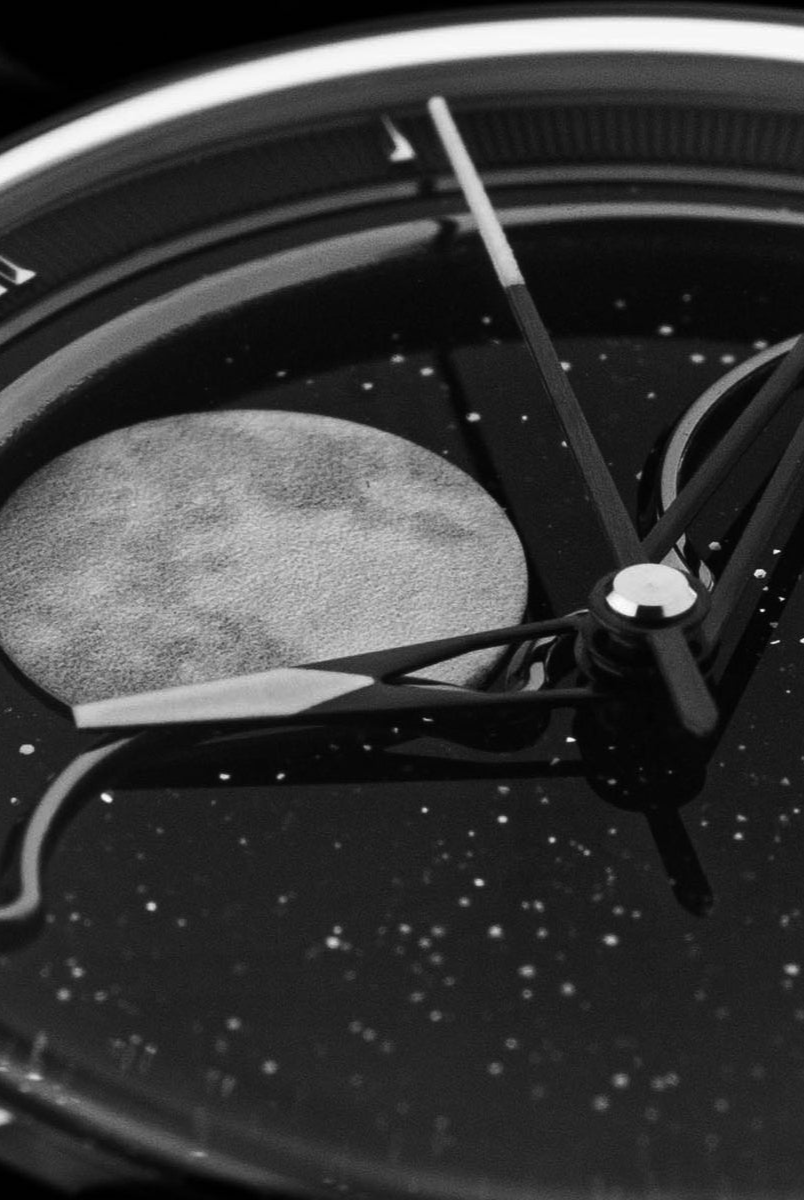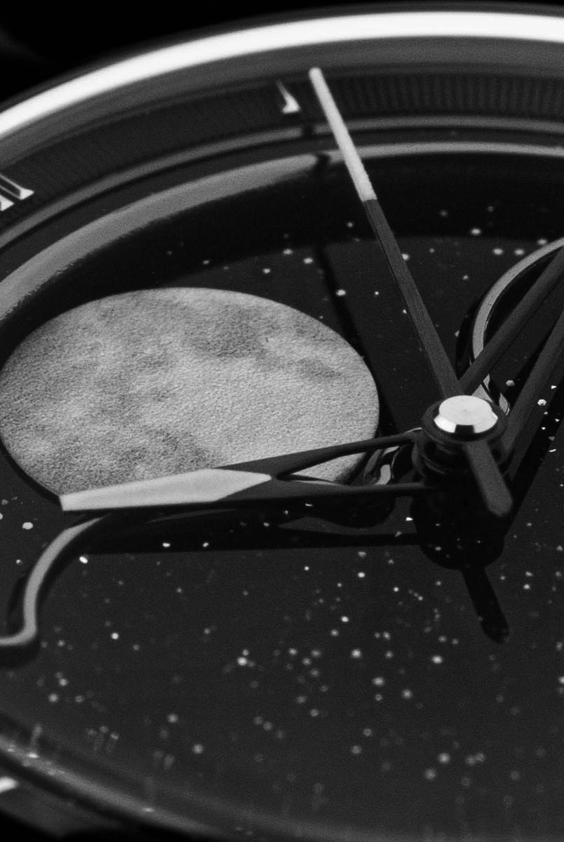 The central focus of the watch is the moon, and we aimed for excellence in its representation. After experimenting with various methods, we settled on a distinctive approach – a mother of pearl circle cut-out featuring a 3D-printed moon texture. This design vividly captures the intricate details of the actual moon, creating the illusion of a celestial body adorning your wrist. To enhance its prominence, the moon is delicately embraced by a CNC mirror-polished frame. Positioned on a single rotating aventurine disc, the moon is surrounded by luminescent stars that glow in the dark, thanks to the application of Swiss Super-LumiNova®. This uncompromising craftsmanship achieves a luminous night sky effect, making the watch a captivating celestial companion.