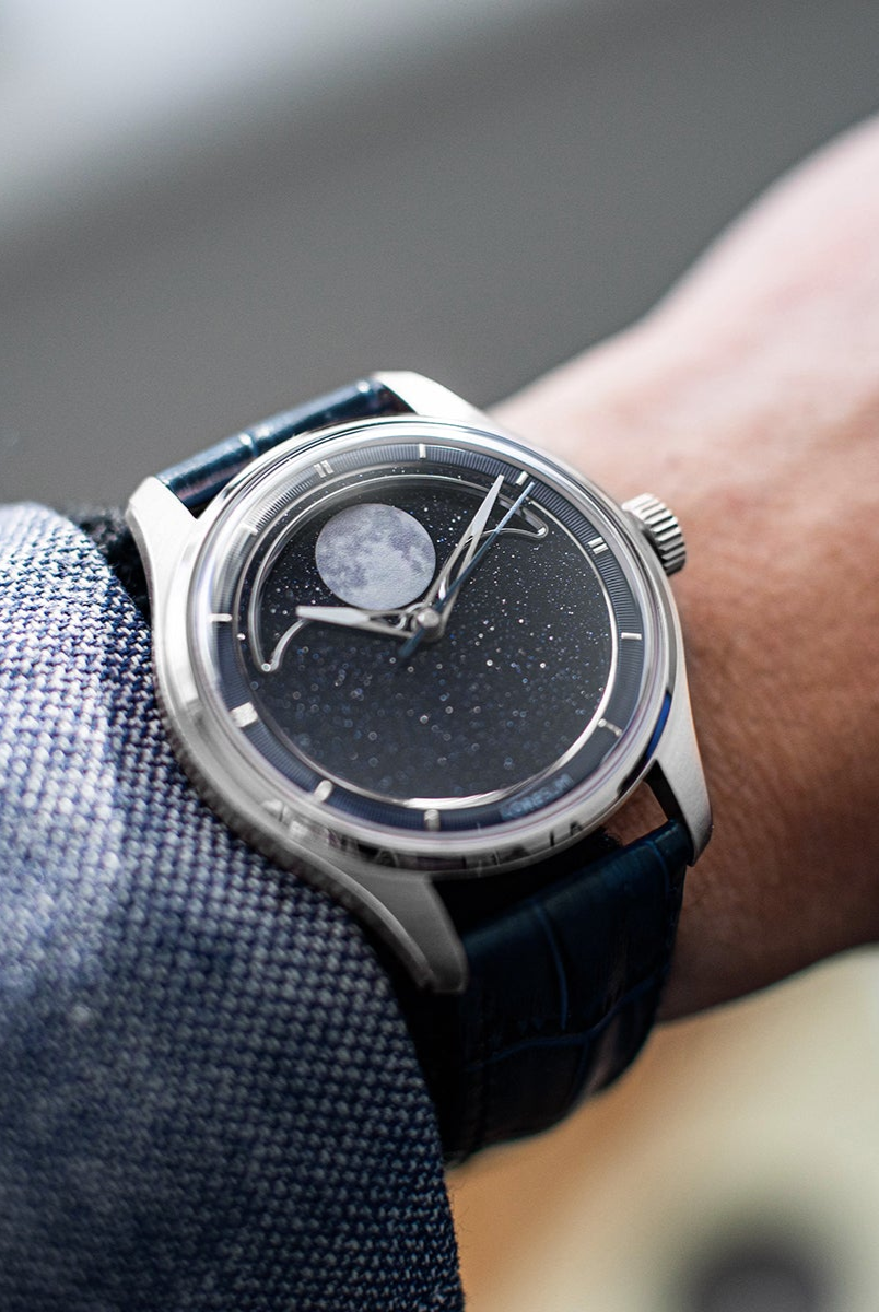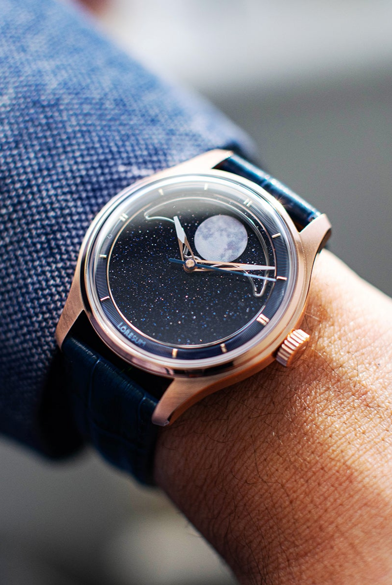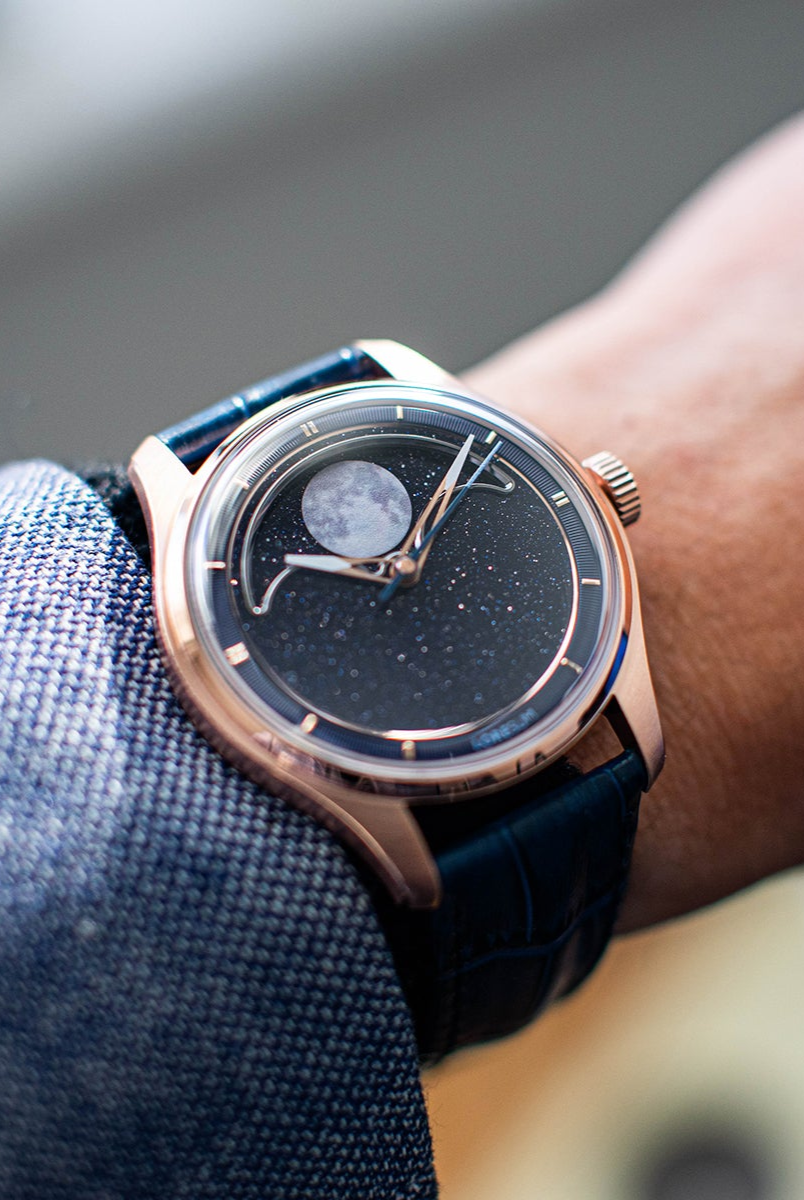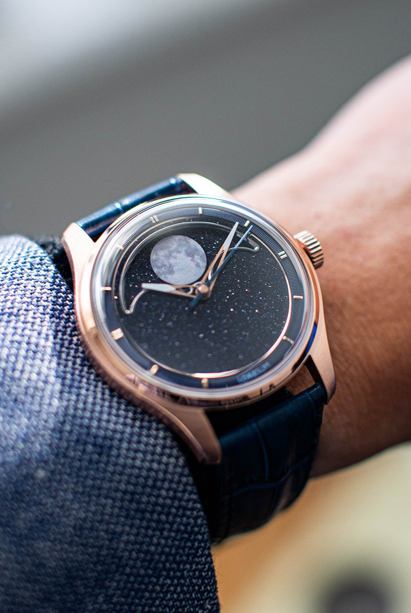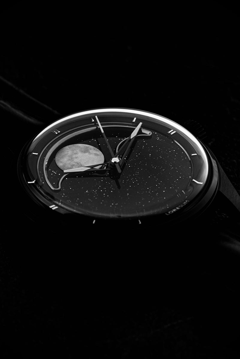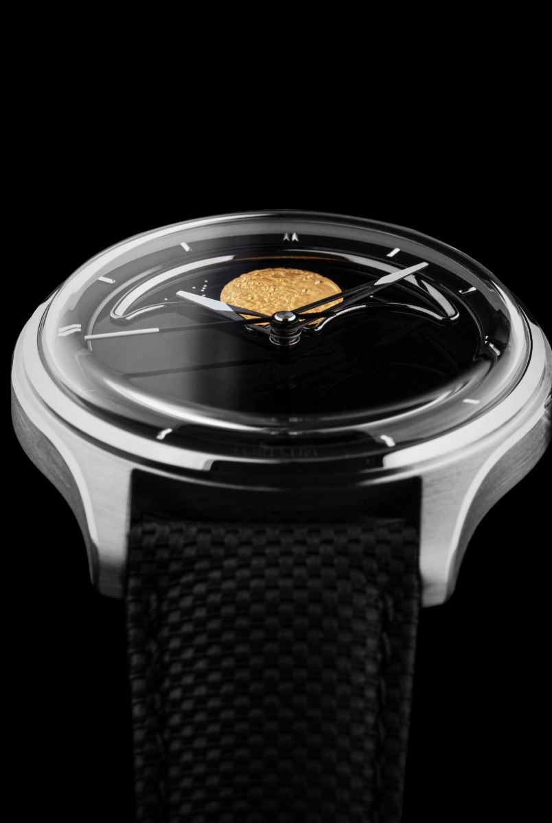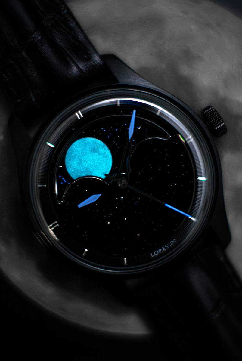 The central focus of the watch is the moon, and we aimed for excellence in its representation. After experimenting with various methods, we settled on a distinctive approach – a mother of pearl circle cut-out featuring a 3D-printed moon texture. This design vividly captures the intricate details of the actual moon, creating the illusion of a celestial body adorning your wrist. To enhance its prominence, the moon is delicately embraced by a CNC mirror-polished frame. Positioned on a single rotating aventurine disc, the moon is surrounded by luminescent stars that glow in the dark, thanks to the application of Swiss Super-LumiNova®. This uncompromising craftsmanship achieves a luminous night sky effect, making the watch a captivating celestial companion.