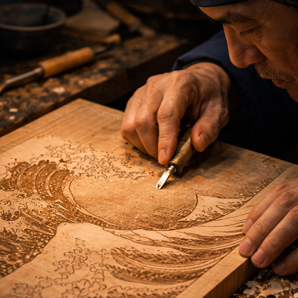 Traditionally, ukiyo-e prints were made through a detailed woodblock printing process involving teamwork rather than a single artist. First, the artist created a final ink drawing, which was then transferred onto a wooden block to carve the “key block,” responsible for the main outlines. Additional blocks were carved separately for each colour, sometimes requiring many blocks for one image. A printer would then apply pigments onto each block and press paper onto them one layer at a time, carefully aligning every impression using registration marks. Through this layered hand-printing technique, ukiyo-e achieved its signature crisp linework, flat yet vibrant colour fields, and subtle gradients—effects that are especially evident in the iconic blue tones of The Great Wave.