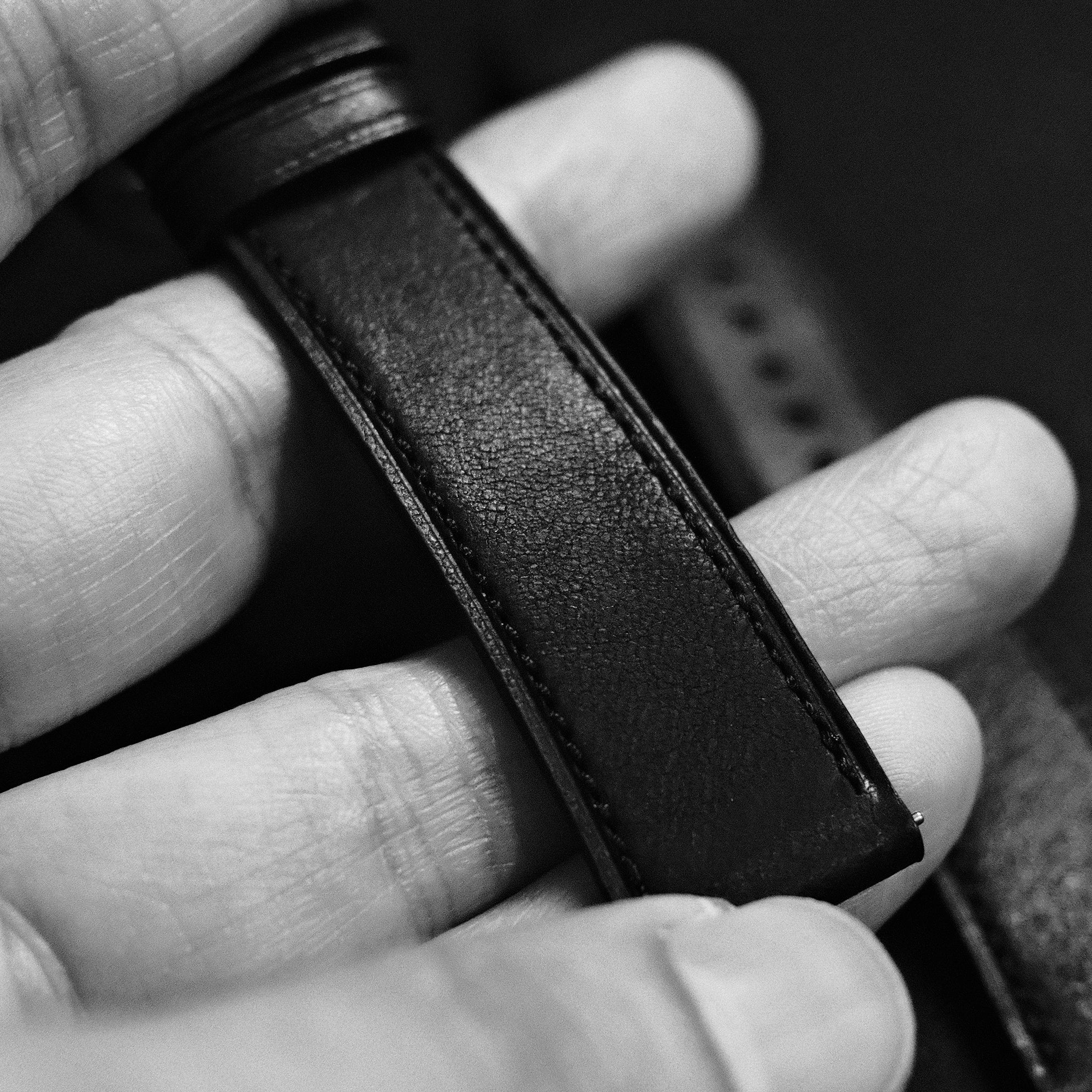 Crafted from premium vegetable-tanned leather by Conceria 800—a historic Italian tannery founded in 1969 in Santa Croce sull’Arno—this full-grain strap designed in a seamless double up construction; offers a consistently soft, supple feel with a deep black finish and signature pull-up effect that reveals rich tonal depth over time.