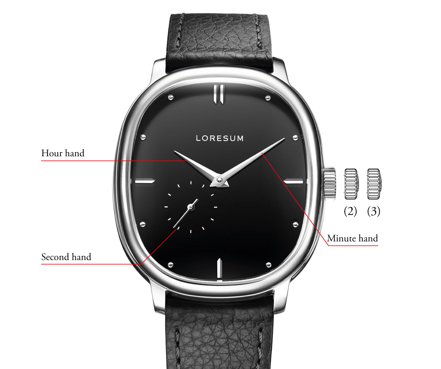 To set the hour and minute discs, pull the crown out to the second notch (Position 3). Turn the crown clockwise to set the hour and minutes. Push the crown back in to complete the time setting.